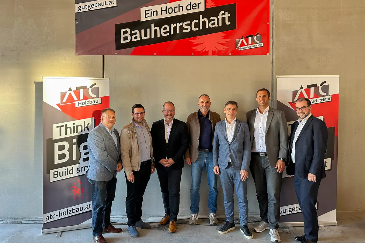 Erstes Bild v.l.n.r: Gemeinderat Jürgen Kremsner, Christoph Prießner (Regional Manager / ISS), Christian Grohs (Director Business Services & Public / ISS), Reinhard Pasteiner (Eigentümer & CEO / ATC), Günther Tullits (COO / ELIN), Michael Sommer (Bereichsleiter NÖ & BGLD / ELIN) und Thomas Dworschak (CPO / ELIN)